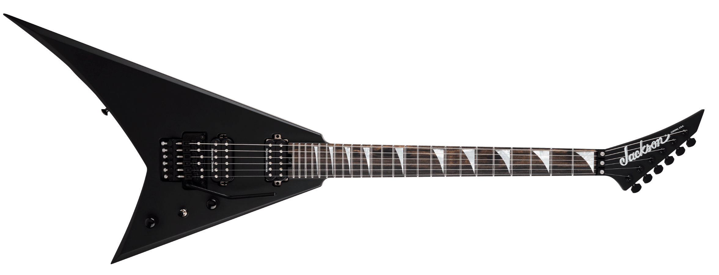 - American Series Jackson Rhoads RR24: ‘American Series’ Rhoads with 24 fret option. Alder body, three-piece maple neck (neck-thru). Rolled ebony fretboard. 24 Jumbo stainless steel frets with inverse MOP sharkfin inlay. Seymour Duncan JB/59 HH pickups (direct mount). Floyd Rose 1500 trem. Luminlay side dots. Heel-mount truss rod adjust. Vol, tone, toggle. Black hardware. Gotoh locking tuners. Dunlop strap buttons. Foam-core case. Reverse headstock. Headstock matches finish. Finishes: black, snow white