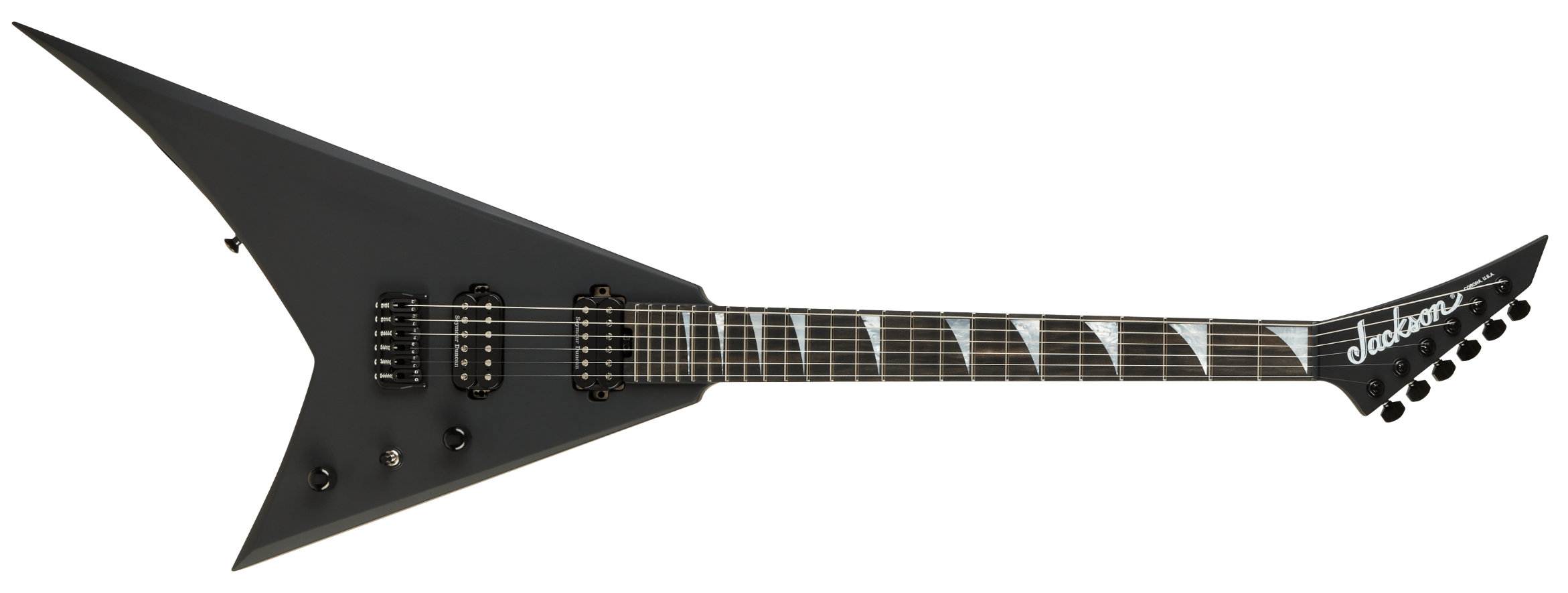 - Jackson Warrior JS32: Later ‘JS Series’ Warrior. Made in India. Indian Cedro (’11), basswood (’13) or poplar (’16-) body. Bolt on maple neck, bound (-’13) rosewood fretboard with pearloid sharkfin inlay. Jackson CVR-2 HH or Jackson JE-10 HH pickups. Black or chrome hardware. Jackson licensed Floyd Rose tremolo. Finishes: black, satin gray, satin black, snow white, black with white bevels